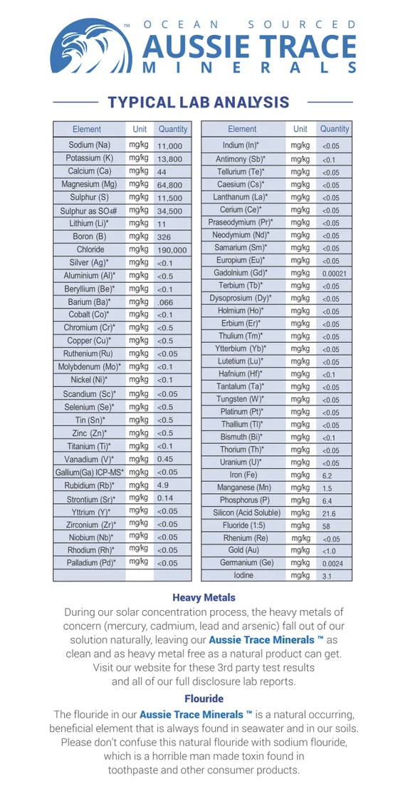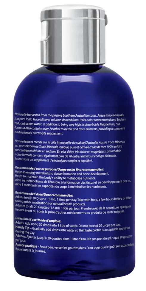 Aussie Trace Minerals, Electrolytes are naturally harvested from the pristine Southern Australian coast, Aussie Trace Minerals is a pure IONIC trace mineral solution derived from 100% solar concentrated and sodium reduced ocean water. In addition to being very high in absorbable Magnesium, it also contains over 70 other minerals and electrolytes, making it a complete and balanced formula.