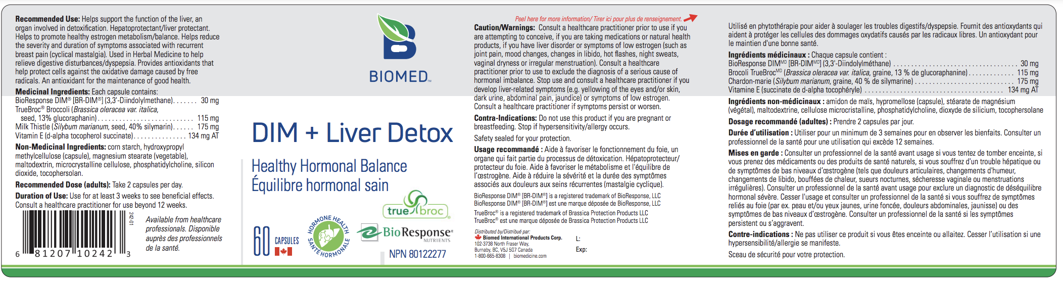 Biomed DIM + Liver Detox is a combination of BioResponse DIM and TrueBroc broccoli sprout extract (glucoraphanin) with milk thistle and vitamin E. This form of DIM (diindolylmethane) uses a patented microencapsulation technology and is the only DIM with clinically proven absorption for assimilation within the body.