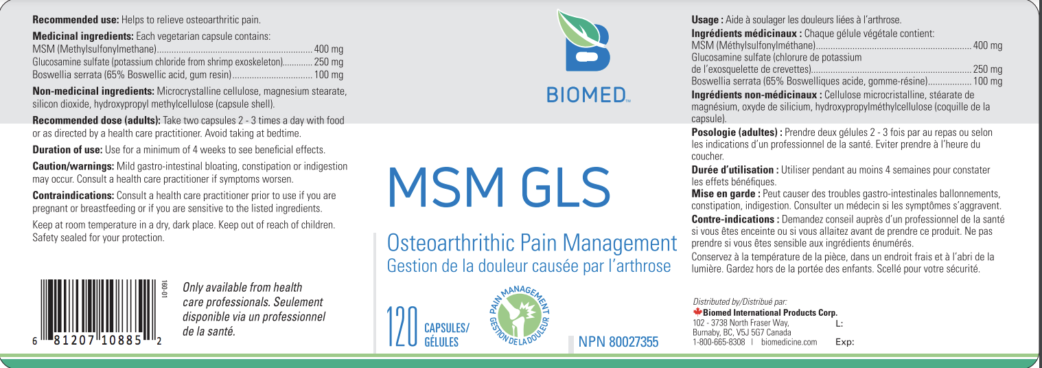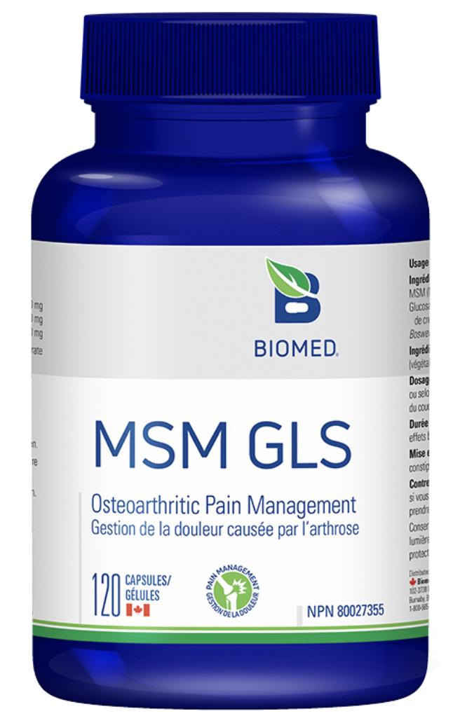 Biomed MSM-GLS is a complementary combination of methylsulfonylmethane (MSM) and Glucosamine sulfate (GLS) with the addition of a notable anti-inflammatory botanical: Boswellia serrata. Research involving osteoarthritis patients have shown that MSM and GLS are more effective and work faster in combination than separately at reducing pain and inflammation. MSM-GLS from Biomed is effective in cases associated with arthritis (osteo and rheumatoid), sports injuries, muscle sprains and strains.