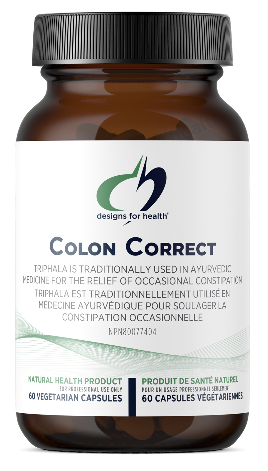 Colon Correct from Designs For Health features two research-backed ingredients to help support optimal bowel motility and tonicity in people with occasional constipation. Colon Correct’s formulation includes Magnesium hydroxide, a well-known ingredient that works by osmosis, draws water from surrounding tissues to the intestines; this local increase of water not only softens the stool, but it also has a positive influence on the volume of the feces, which promotes intestinal motility. In the Ayurvedic tradition, Triphala, a classic formula, consists of three fruits, Amalaki, bibhitaki, and haritaki. Amalaki (known as Indian gooseberry or amla) is considered one of the best rejuvenating herbs. In addition to its laxative effects, Haritaki also has astringent properties and balances Vata. Bibhitaki is an excellent rejuvenative, with both laxative and astringent properties. It balances the Kapha dosha. Colon Correct can be used for short periods of time as a mild laxative for occasional constipation.