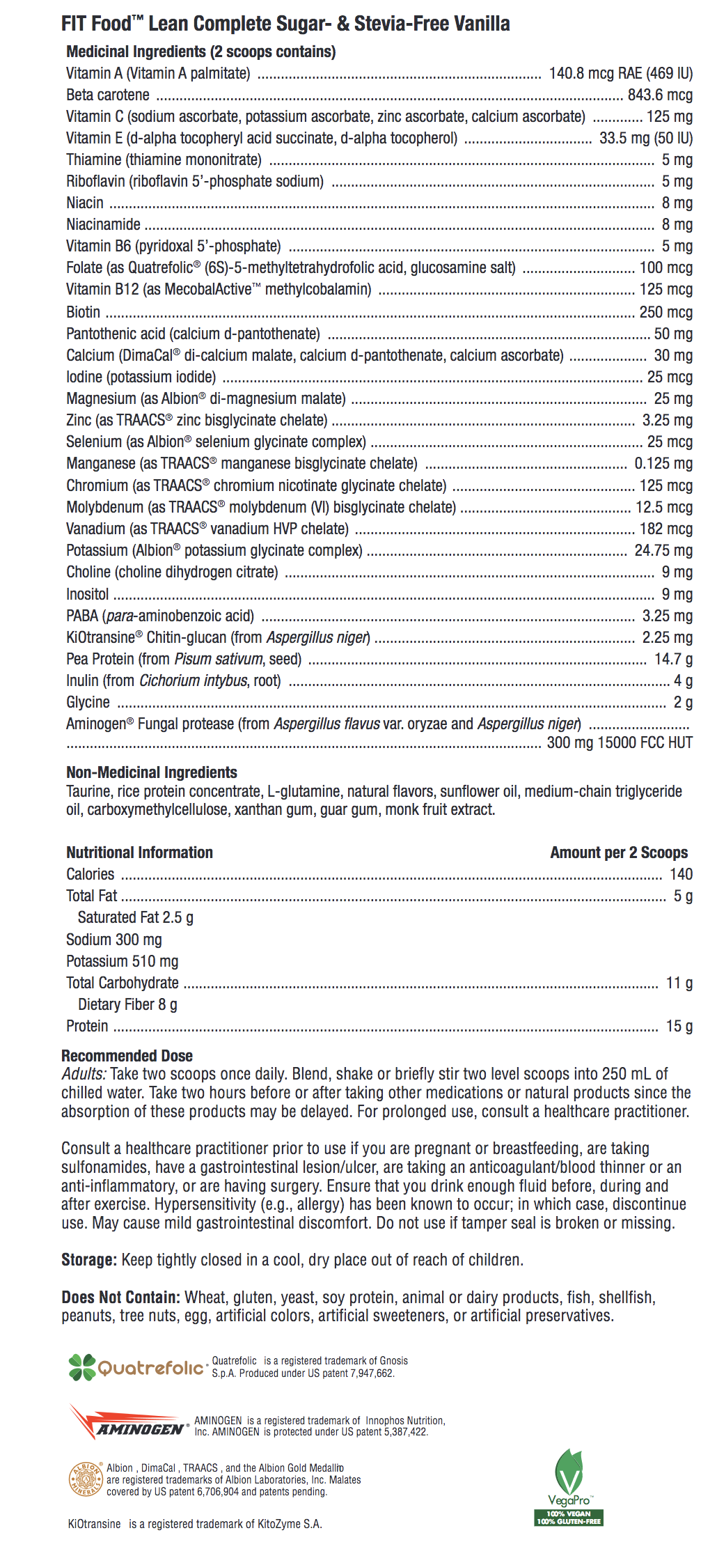 FIT Food Lean Complete (Vanilla) is Sugar- & Stevia-Free.