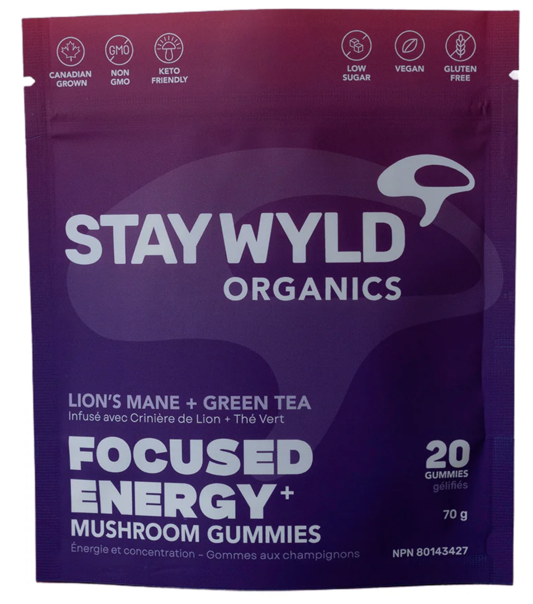Focused Energy+ Mushroom Gummies From Stay Wyld Organics offers a clean, low-sugar energy powered by Lion’s Mane + Green Tea.