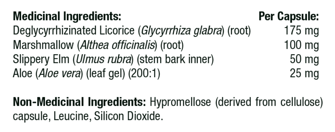• Slippery elm bark (Ulmus rubra) and marshmallow root (Althea officinalis) contain mucilaginous components to help soothe the digestive tract