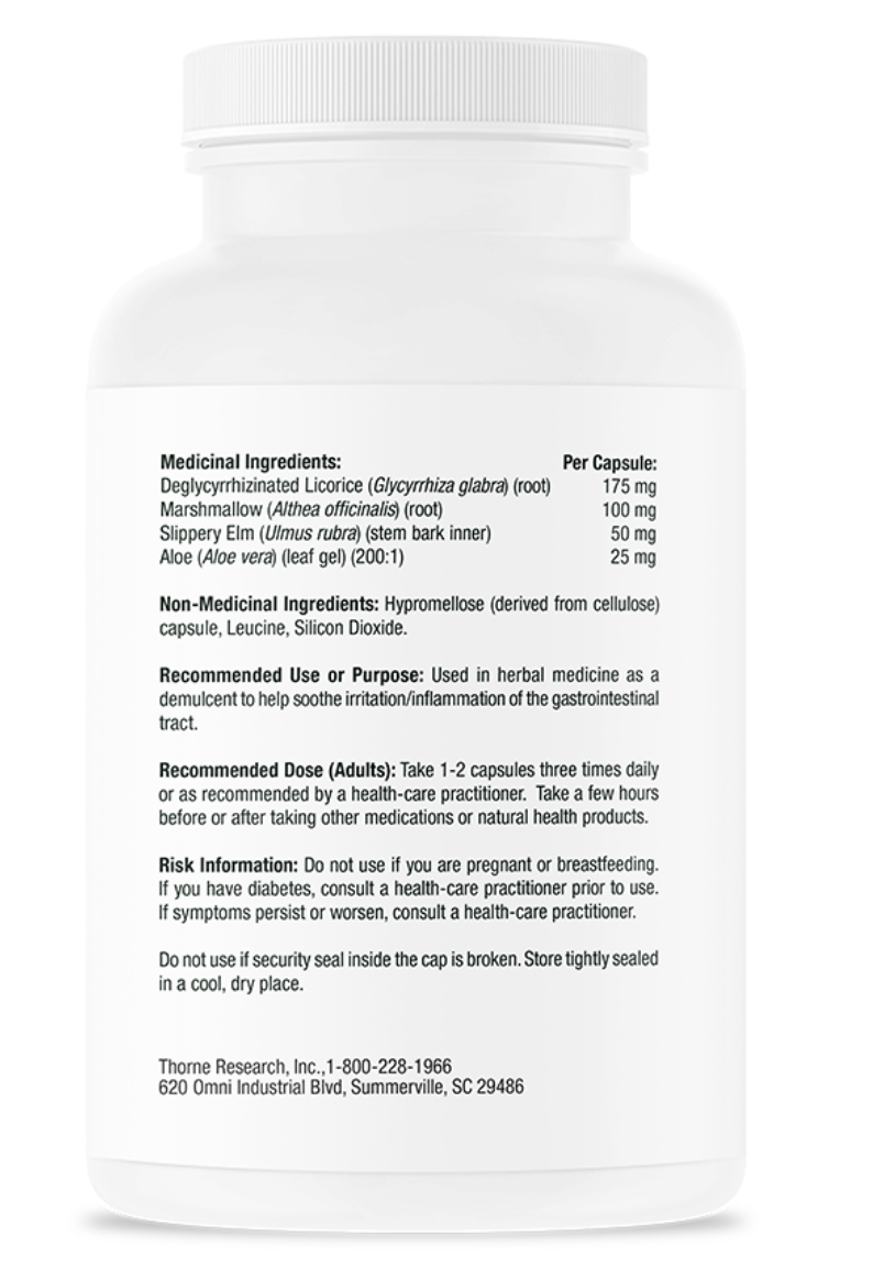 GI Relief from Thorne provides a comforting blend of botanical extracts – aloe vera, slippery elm, marshmallow root, and licorice – to calm irritation and soothe the mucous membranes of the GI tract.