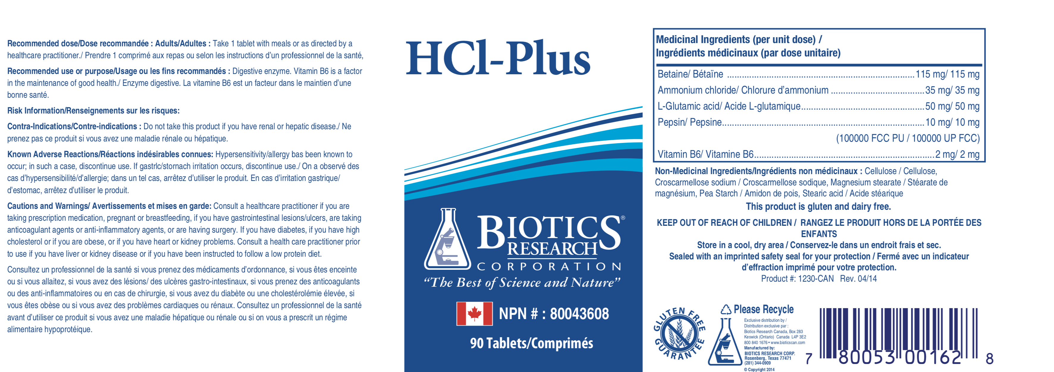 HCL-Plus from Biotics Research provides digestive support via supplemental Betaine hydrochloride, Pepsin and known synergist. Consider when the need for supplemental hydrochloric acid is indicated.
