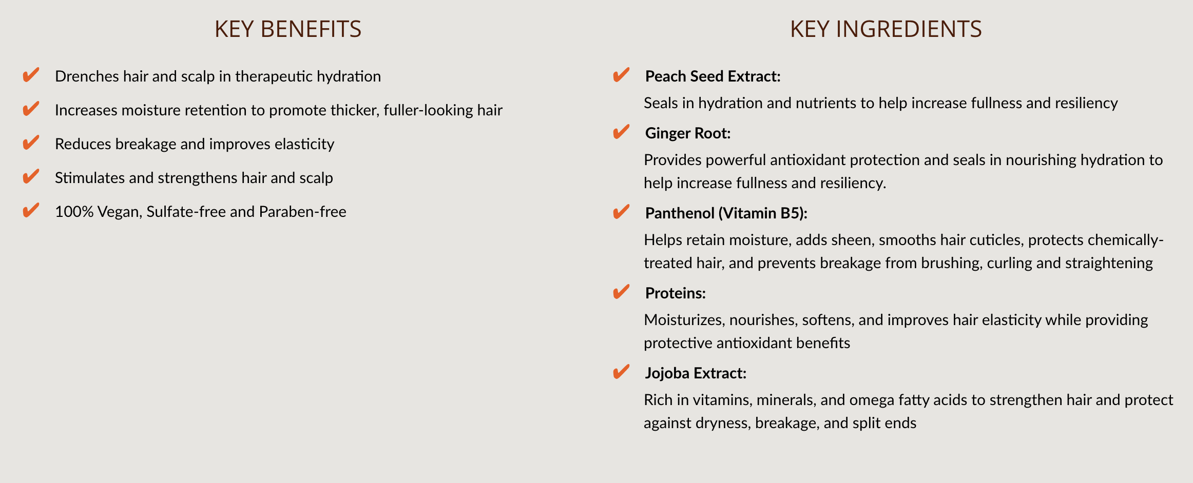 Water/Eau, Cetearyl alcohol, Dicaprylyl maleate, Glycerin, Hydroxypropyl guar, Panthenol, Diglycerin, Codonopsis tangshen root extract, Glycyrrhiza glabra (licorice/réglisse) root extract, Paeonia albiflora (peony/pivoine) root extract, Polygonum multiflorum extract, Prunus persica (peach/pêche) kernel extract, Aloe barbadensis (aloe vera) leaf juice(1), Biotin, Hydrolyzed soy protein/Protéine de soja hydrolysée, Hydrolyzed wheat protein/Protéine de blé hydrolysée, Hydrolyzed oat protein/Protéine d’avoine hydrolysée, Tocophersolan, Camellia sinensis (green tea/ thé vert) leaf extract(3), Simmondsia Chinensis (jojoba) seed extract(2), Eugenia caryophyllus (clove/girofle) leaf oil(2), Foeniculum vulgare (fennel/fenouil) seed extract(4), Zingiber officinale (ginger/gingembre) root extract(4), Urtica dioica (nettle/grande ortie) extract(4), Scutellaria lageriflora extract(4), Vitis vinifera (grape vine/vigne) leaf extract(3), Melissa officinalis (lemon balm/mélisse citronnelle) leaf extract(3), Punica granatum (pomegranate/grenade) extract(3), Hydrolyzed algae extract/Extrait d’algues hydrolysées, Mentha piperita (peppermint/menthe poivrée) oil, Lavandula angustifolia (lavender/lavande) oil, Eucalyptus glubulus leaf oil, Cinnamidopropyltrimonium chloride, Citric acid, Sodium PCA, Bixa orellana (achiote/roucou) seed oil, Hydroxypropyl guar Hydroxypropytrimonium chloride, Sodium phytate, Phenoxyethanol, Caprylyl glycol, Caramel.