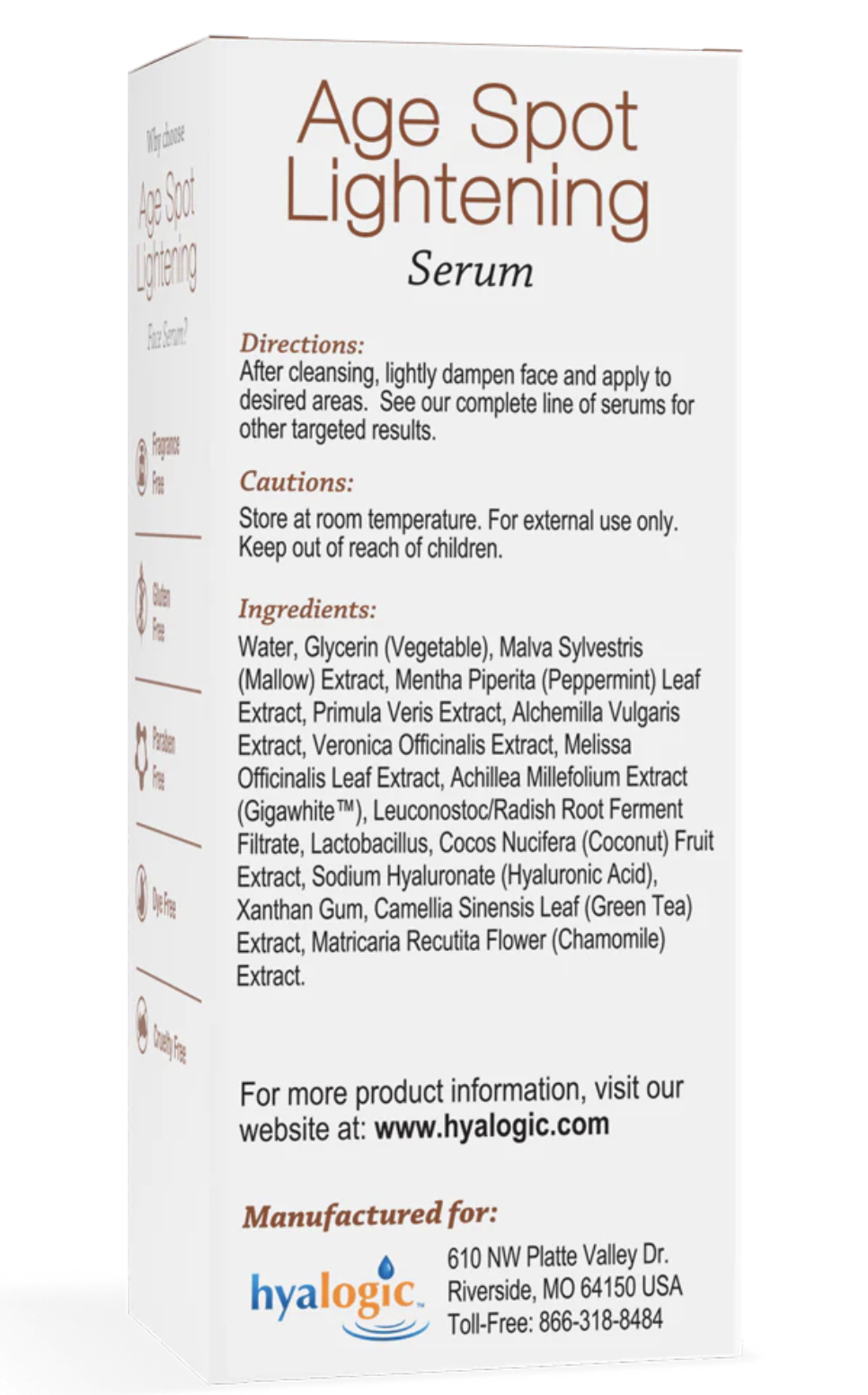 Hyalogic’s Age Spot Face Serum is a combination of Hyaluronic Acid and Gigawhite designed to hydrate your skin while lightening the appearance of age spots. Soothe, nourish and rejuvenate your skin while lightening the appearance of age spots.
