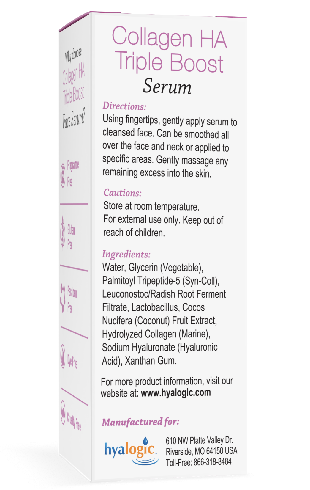 Hyalogic Collagen HA Triple Boost Face Serum is formulated to help support healthy skin collagen and bring back the appearance of healthy skin elasticity and firmness.  The unique formula combines three ingredients designed to maintain healthy skin collagen: Hyaluronic Acid to moisturize and hydrate, SYN®-COLL to help support natural collagen production and a special Marine collagen that promotes healthy, youthful looking skin.