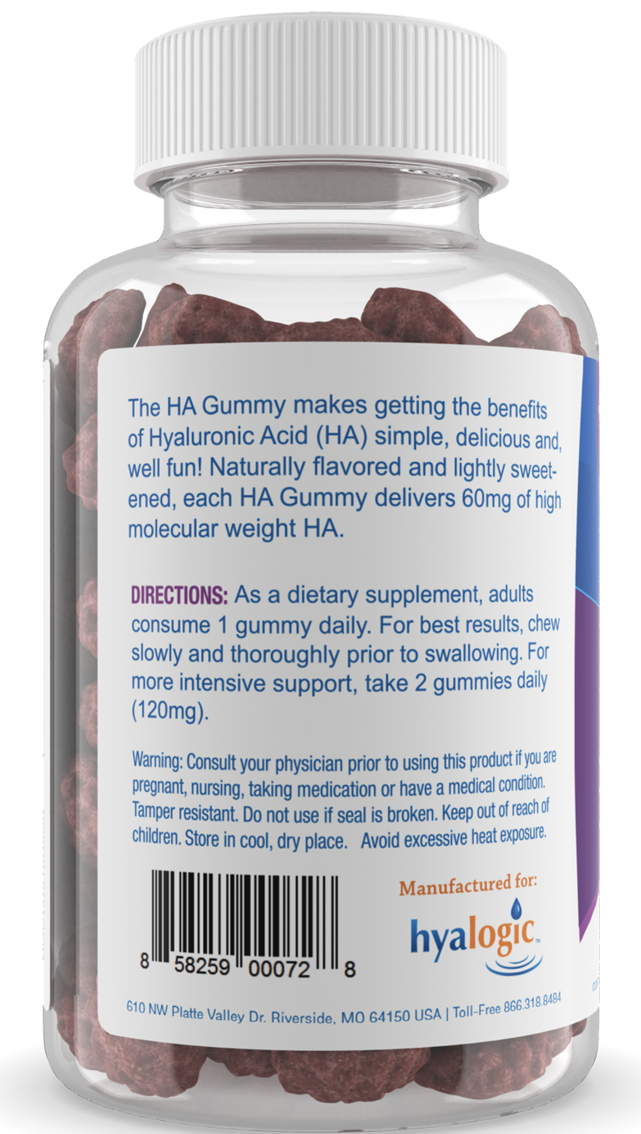 Enjoy the benefits of Hyaluronic Acid in a fun and tasty way with Hyalogic HA Gummy—a delicious, naturally berry-flavored gummy that makes wellness feel like a treat. Each gummy delivers 60 mg of high-quality, high molecular weight Hyaluronic Acid to support healthy joints, cartilage, skin, eyes, bones, and hair. Lightly sweetened and gluten-free, it’s an easy, enjoyable way to add daily hydration and joint support to your routine—no pills or powders required.