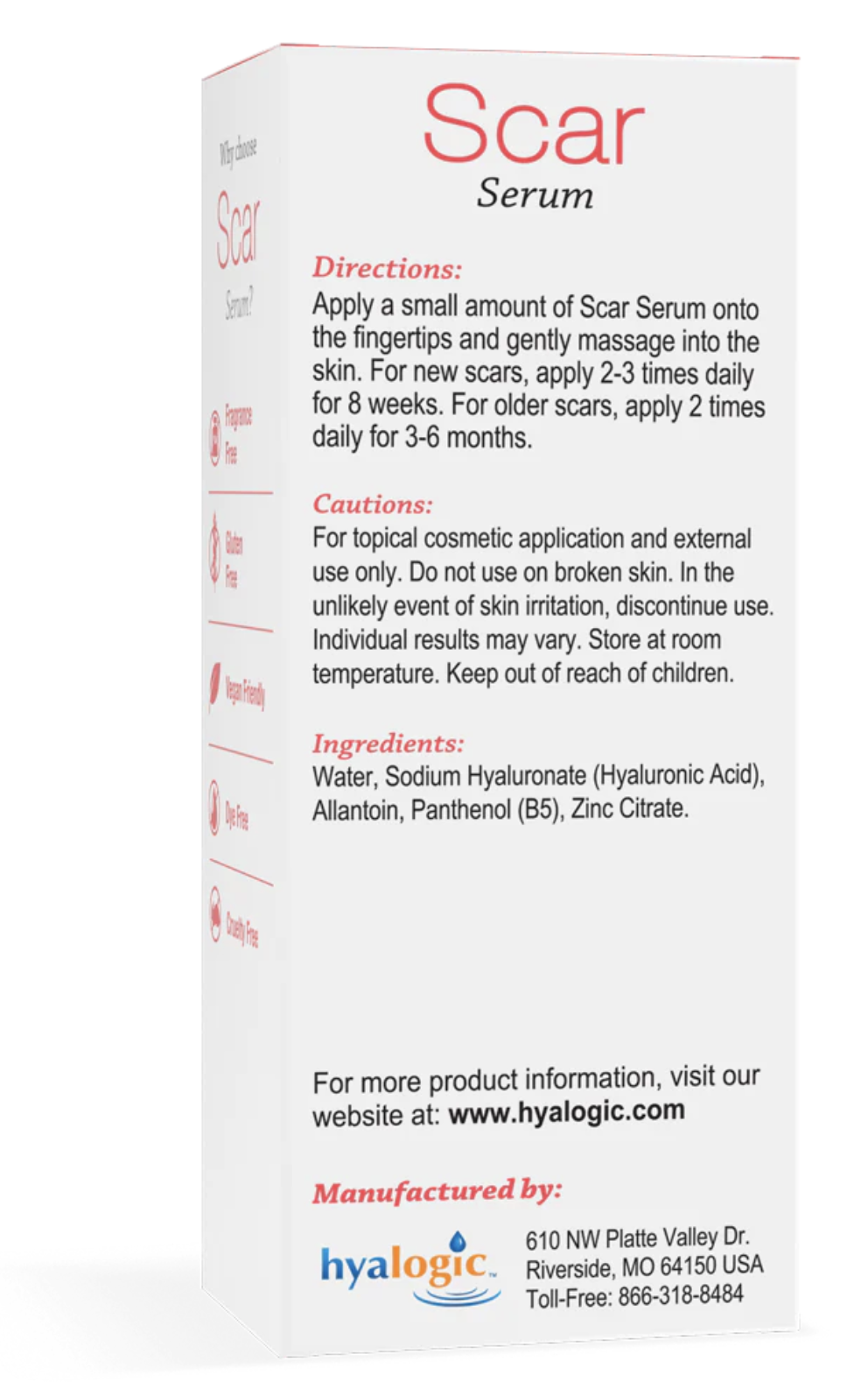 Hyalogic Scar Serum is ideal for use on both new and existing scars, it also helps to soften the look of hardened or rough skin. Scar Serum’s odorless, non-oily formula absorbs quickly and won’t stain clothing, making it a convenient addition to your daily skincare routine.