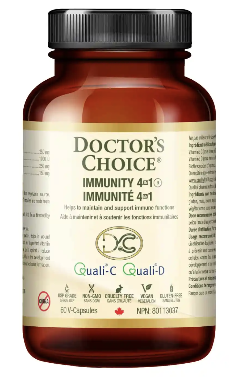 Immunity 4 in 1 from Doctor’s Choice helps maintain and support the immune function. Made in Canada Vitamin C sourced from Scotland Vitamin D sourced from Switzerland Bioflavonoids sourced from the USA Quercetin sourced from Brazil 100% USP Pharmaceutical Grade Non-GMO Gluten Free Cruelty Free