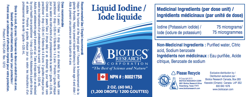 Liquid Iodine by Biotics Research supplies 75 mcg of iodine (as potassium iodide) per drop. Iodine is an essential trace mineral, and is vital to healthy thyroid function. Vegetarians may be at increased risk of iodine deficiency.