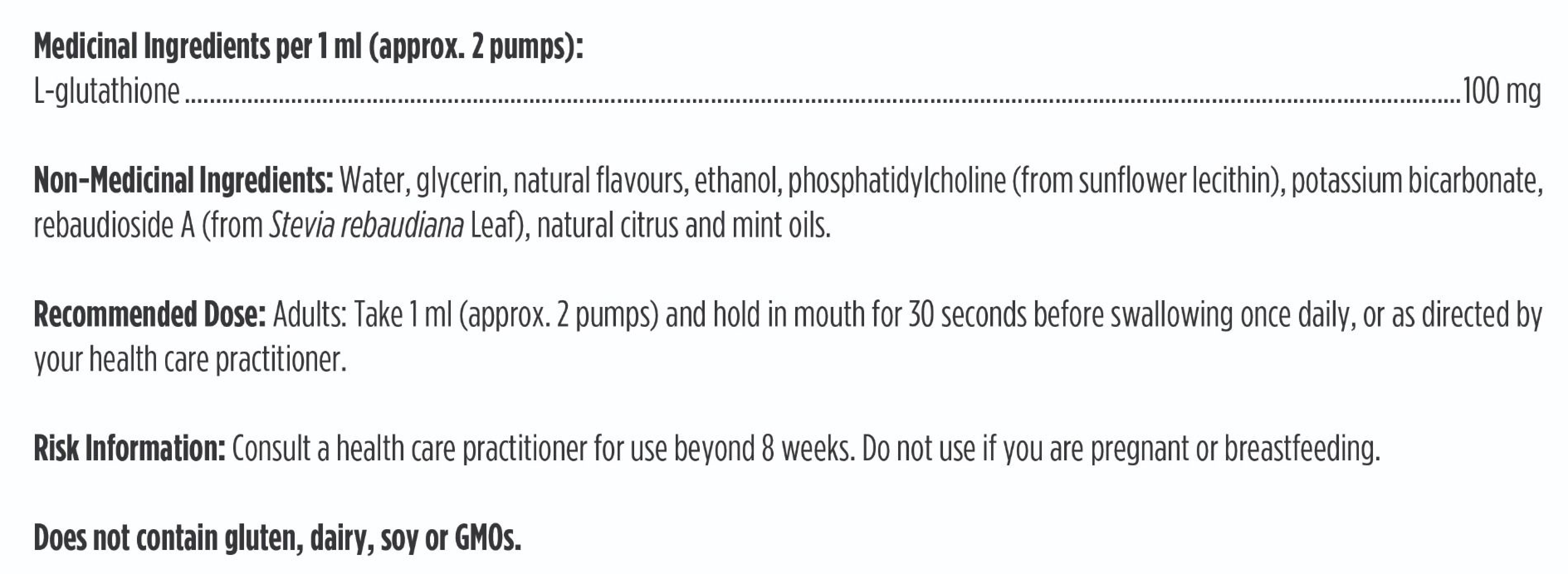 Each 1 mL serving (approximately 2 pumps) of this lemon-peppermint flavored formula provides 100 mg of reduced glutathione. Glutathione is one of the most powerful antioxidants naturally produced in the body, as it protects virtually every tissue.