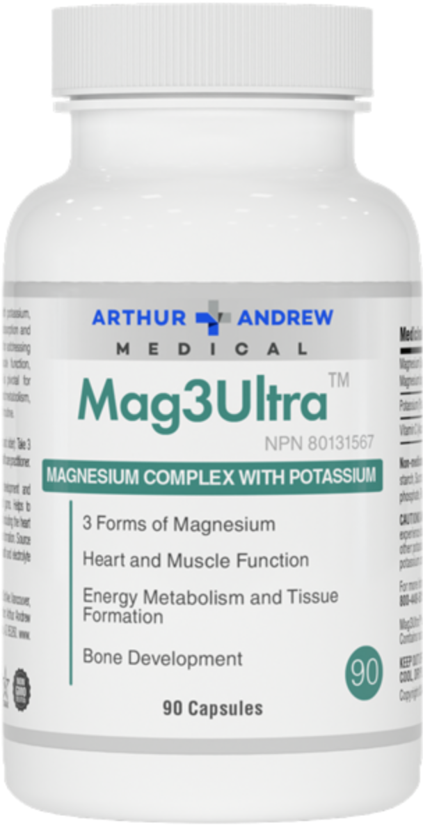 Mag3Ultra from Arthur Andrew Medical is a premium triple-form magnesium supplement enhanced with potassium that supports countless metabolic processes such as heart, bone, and muscle function, as well as sleep quality.