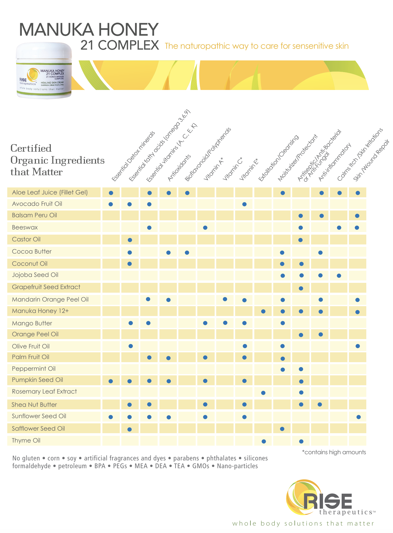 Manuka Honey 21 Complex from Rise Therapeutics is blended with active New Zealand 12+ Manuka honey and twenty-one additional active organic botanicals such as aloe fillet gel, carrot, orange, avocado and pumpkin. The unique phytonutrient complex supports skin repair and promotes skin health by providing a rich complex of essential vitamins (A, C, E & K) and minerals, antioxidents/bioflavonoids, beneficial amino acids and essential fatty acids (omega 3, 6 & 9).