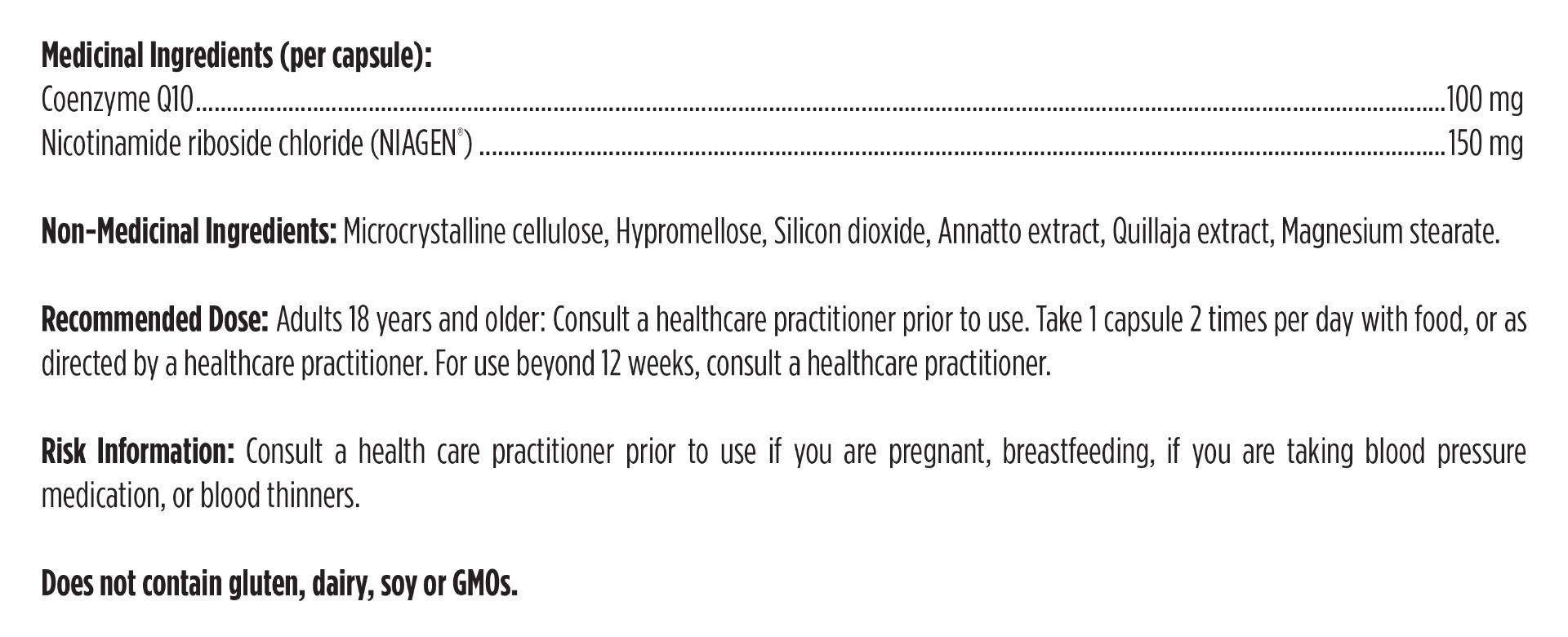 Mito-NR is uniquely formulated to support cellular energy production and cardiovascular health. This formula contains clinically relevant amounts of Niagen, a form of nicotinamide riboside chloride (NR) and coenzyme Q10 (CoQ10) complexed with the non-medicinal ingredient annatto extract which contains naturally occurring geranylgeraniol (GG). NR is a variation of vitamin B3 (niacin) and is a building block to nicotinamide adenine dinucleotide (NAD+). NAD+ is found in every living cell and is essential to many important cellular processes, including energy production.