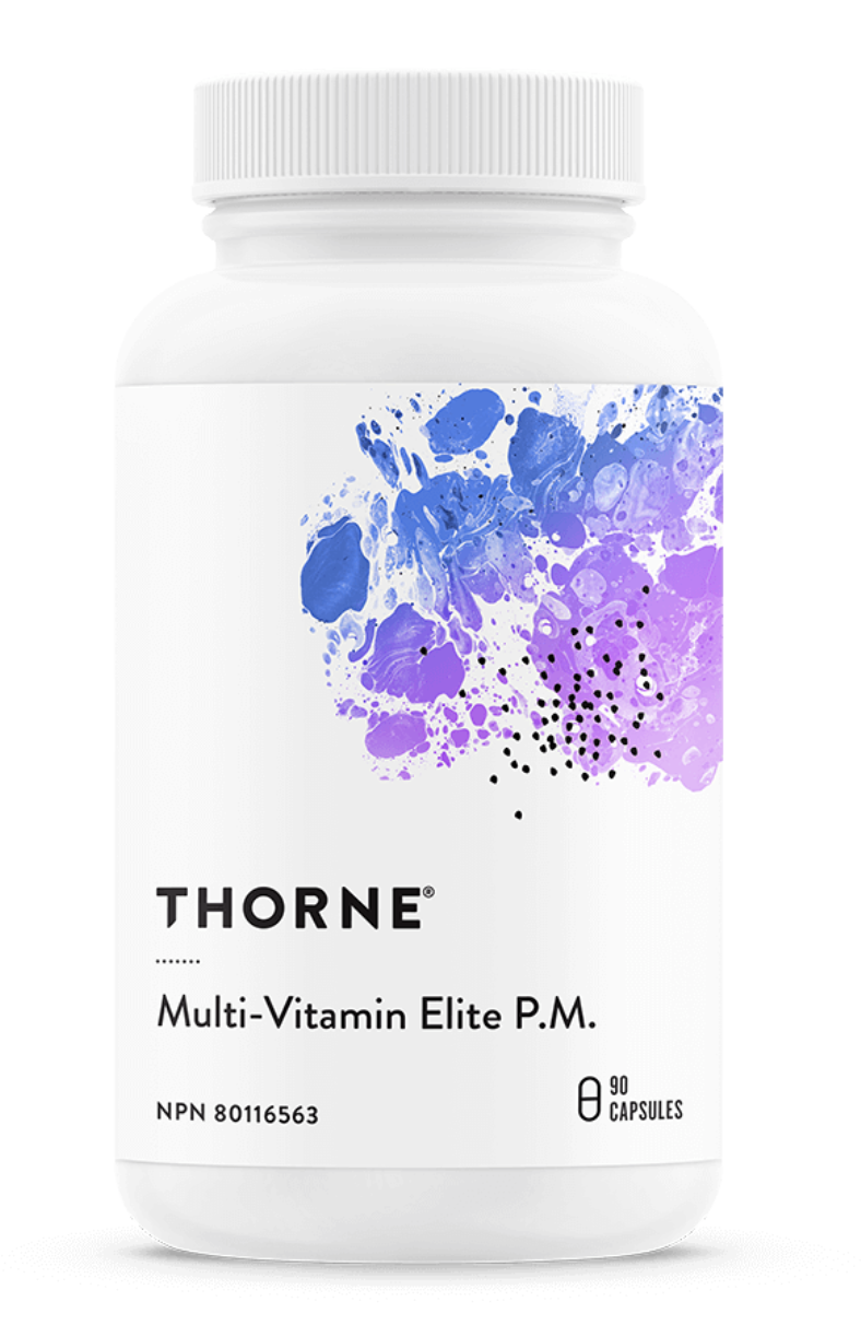 Thorne Multi-Vitamin Elite PM contains a full complement of vitamins and minerals in their most absorbable forms. Vitamin D promotes strong bones and healthy immune function. B vitamins support heart, blood vessel, and nerve health. Vitamins K1 and K2 contribute to bone and blood vessel health.