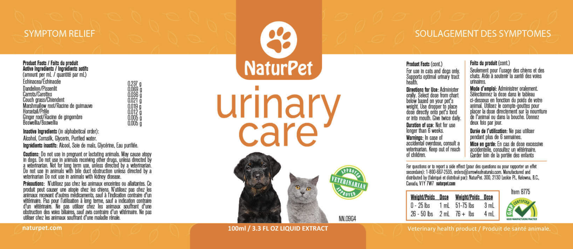 NaturPet Urinary Care, a premium herbal blend specifically formulated to support the urinary health of your beloved pets. This carefully crafted formula combines the power of natural ingredients, including Dandelion Leaf, Wild Carrot, Echinacea, Marshmallow Root, Ginger Root, Couch Grass, Boswellia, and Horsetail. Together, these ingredients work synergistically to promote a healthy urinary system and aid in maintaining optimal urinary function.