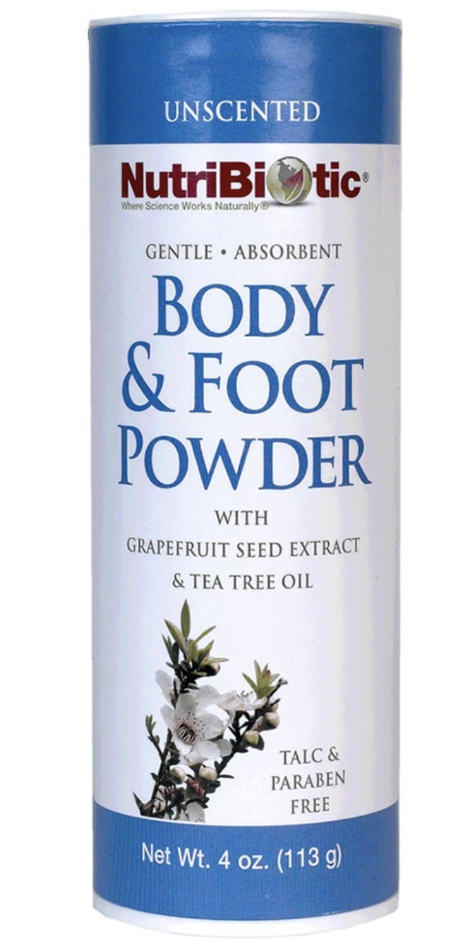NutriBiotic Body & Foot Powders provide support to the skin by absorbing dampness and reducing friction. These mild and 100% talc free formulas contain corn starch and grapefruit seed extract.