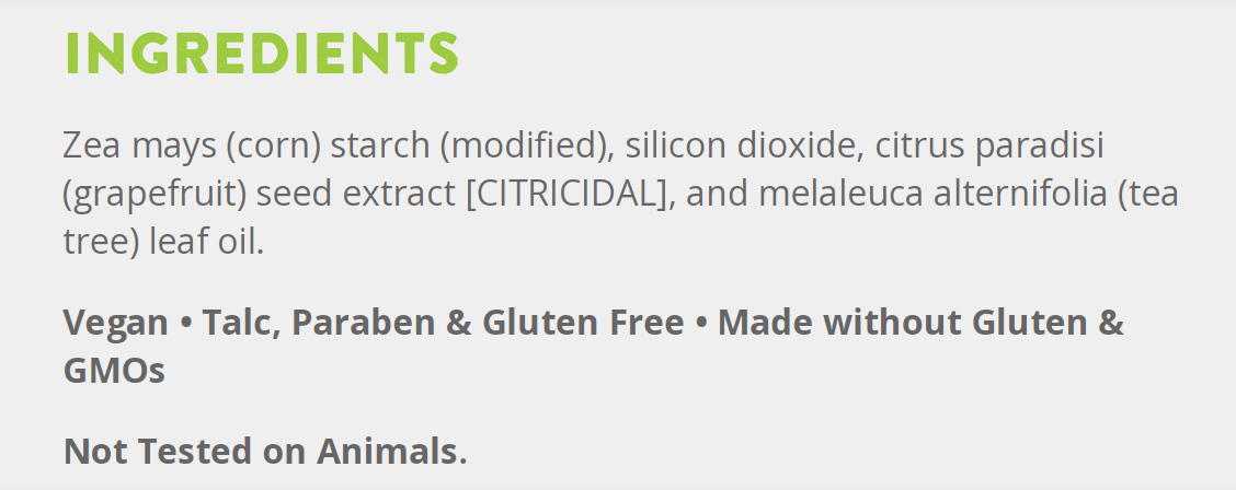 INGREDIENTS: Zea mays (corn) starch (modified), silicon dioxide, citrus paradisi (grapefruit) seed extract [CITRICIDAL], and melaleuca alternifolia (tea tree) leaf oil.