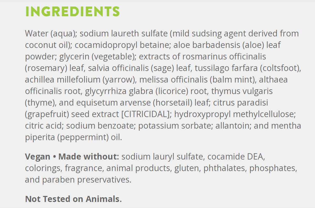 Vegan • Made without sodium lauryl sulfate, cocamide DEA, colorings, fragrance, animal products, gluten, phthalates, phosphates, and paraben preservatives.