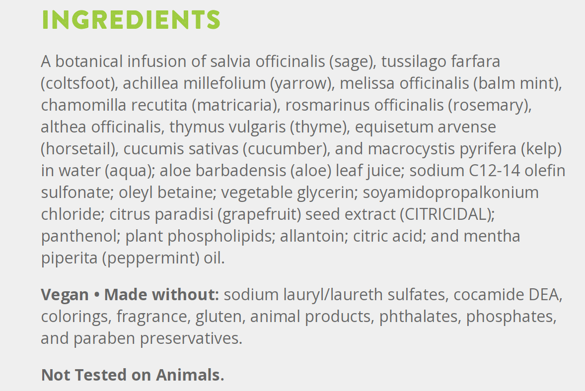 Made without sodium lauryl/laureth sulfates, cocamide DEA, colorings, fragrance, gluten, animal products, phthalates, phosphates, and paraben preservatives.