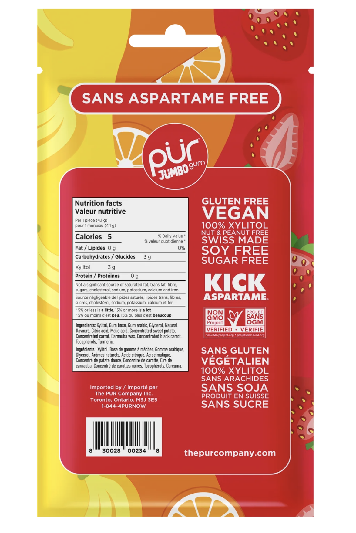 PUR Jumbo Gum is a juicy gum with bold strawberry, banana, and orange flavors, and an extra-large chew to satisfy your cravings!