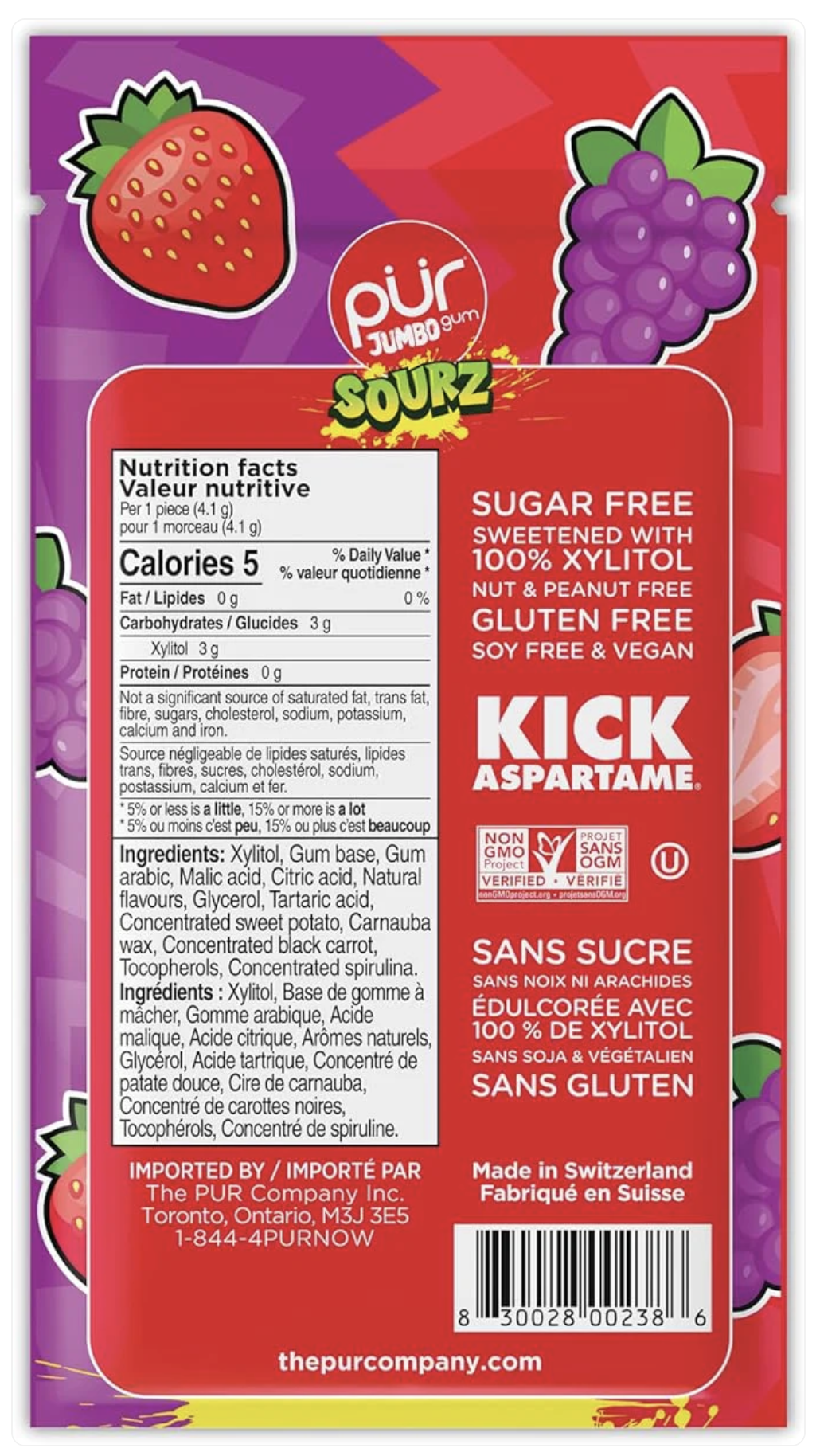 Made for people who care about what they chew, JUMBO SOURZ gum is aspartame-free, sugar-free, and naturally sweetened with 100% xylitol—a natural sweetener with 40% fewer calories than sugar. It’s also vegan, non-GMO, gluten-free, soy-free, nut- and peanut-free, keto-friendly, and Swiss made. Packaged in a convenient resealable bag, it’s the ideal grab-and-go treat that satisfies your sour cravings—guilt-free. PUR believes in making simple, healthy substitutions without sacrificing the fun.