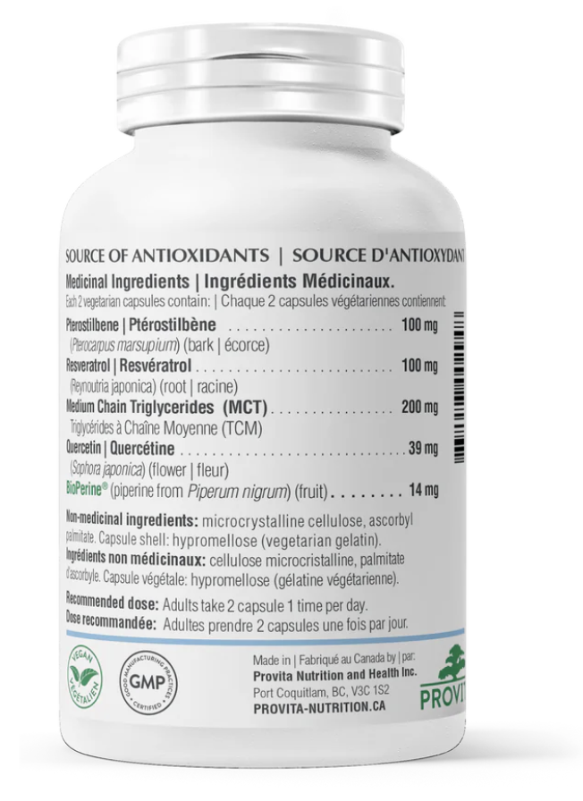 Pterostilbene from Provita is a synergistic anti-aging Pterostilbene and Resveratrol formula. Provita’s Pterostilbene is an antioxidant synergy focused on the anti-aging aspects of pterostilbene and resveratrol. Pterostilbene’s added Quercetin, MCT and Piperine help in boosting the overall bioavailability of these antioxidants.
