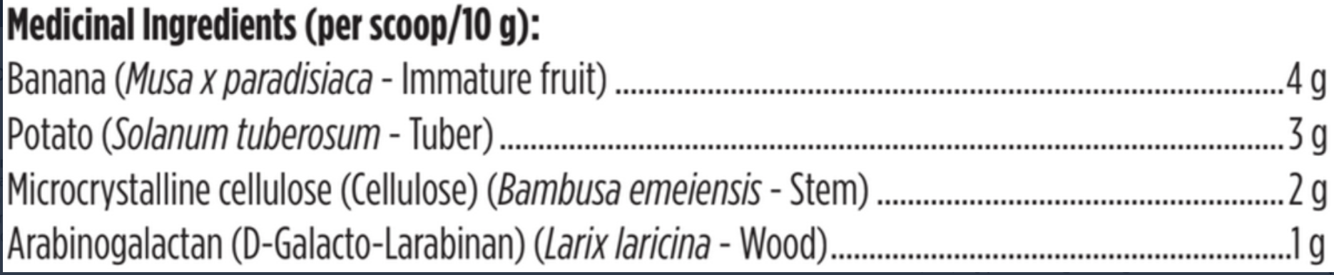 RS Fibre contains two forms of resistant starch (RS) type II: organic green banana flour and organic potato starch powder. RS is a type of starch that is resistant to digestion, as enzymes in the GI tract are inactive against it. Once RS reaches the large intestine, it is fermented into short chain fatty acids, which are used as fuel for both beneficial microbes and enterocytes of the GI tract.