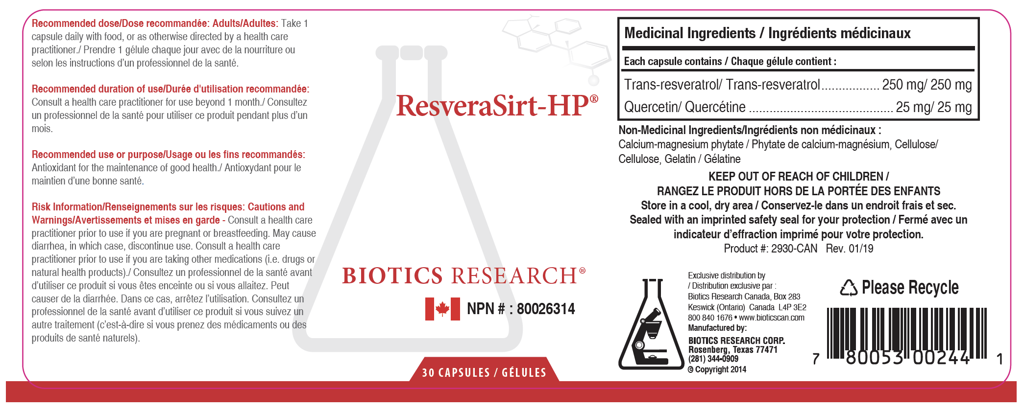 ResveraSirt-HP by Biotics Research is a natural antioxidant supplement that contains 250mg of purified Trans Resveratrol per capsule along with quercetin for its ability to slow the metabolism of resveratrol