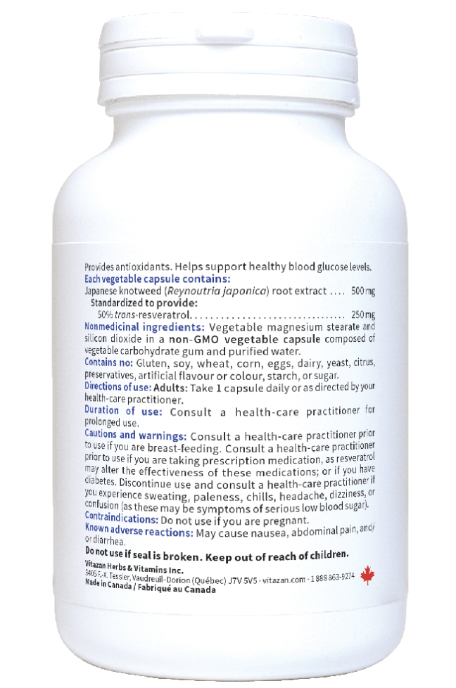 Cautions and warning: Consult a health-care practitioner prior to use if you are breast-feeding. Consult a health-care practitioner prior to use if you are taking prescription medication, as resveratrol may alter the effectiveness of these medications; or if you have diabetes. Discontinue use and consult a health-care practitioner if you experience sweating, paleness, chills, headache, dizziness, or confusion, (as these may be symptoms of serious low blood sugar).