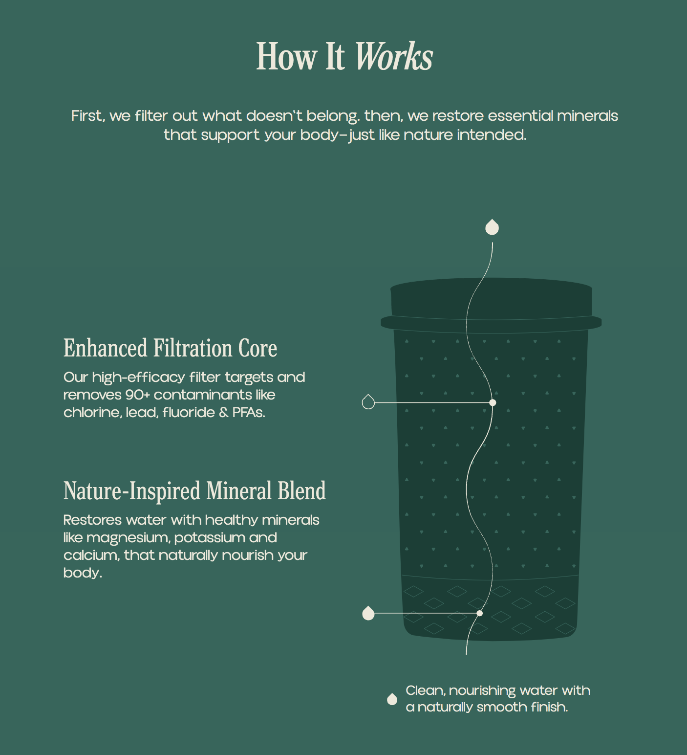 • Restores calcium, magnesium, and potassium for water your body absorbs more effectively.