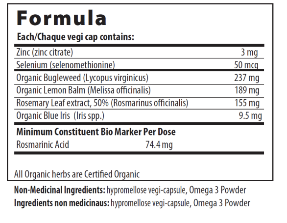 The oleoresins found in Blue flag root support detoxification of the thyroid gland along with healthy liver function. Lemon balm rich in volatile compounds, polyphenols, and rosmarinic acid traditionally a calming and relaxing herb support the neurothyroid relationship.