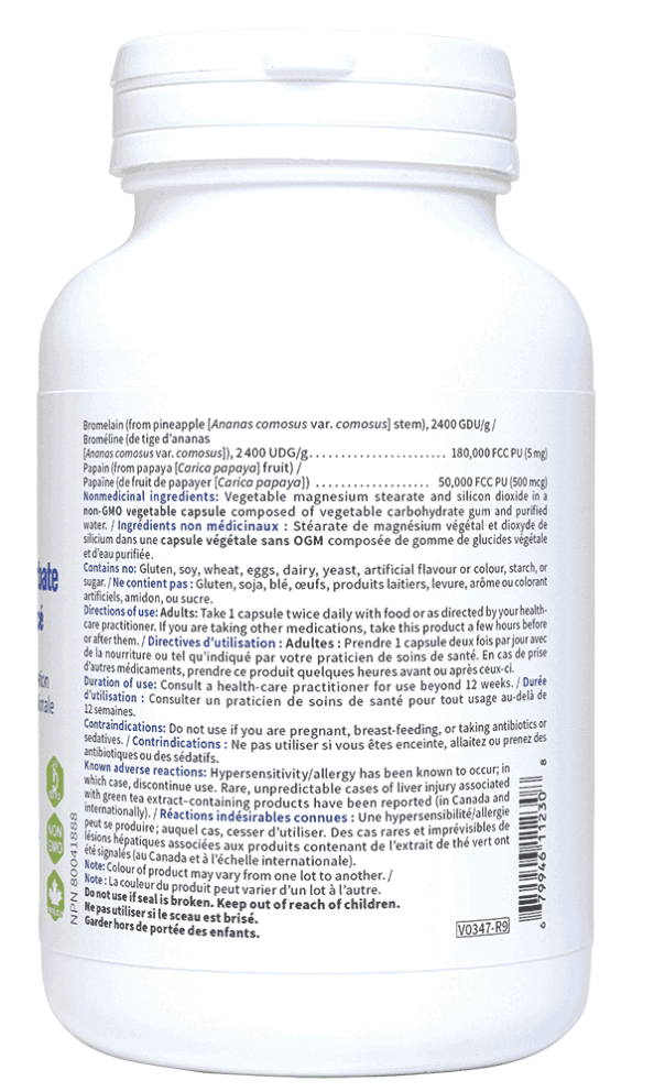 Cautions and warnings: Consult a health-care practitioner prior to use if you have hypertension; if you have a liver disorder; if you have an iron deficiency; if you have a history of kidney stones; if you have an allergy to latex or fruits (such as avocado, banana, chestnut, passion fruit, fig, melon, mango, kiwi, pineapple, peach, or tomato); if you have gastrointestinal lesions/ulcers; if you are taking anti-inflammatory agents or other enzyme products; if you are having surgery; if you are taking blood thinners or anticoagulant agents; or if you are taking any medications or natural health products. Discontinue use and consult a health-care practitioner if you develop symptoms of liver trouble such as yellowing of the skin/eyes (jaundice), stomach pain, dark urine, sweating, nausea, unusual tiredness, or loss of appetite. Rare, unpredictable cases of liver injury associated with green tea extract– containing products have been reported.