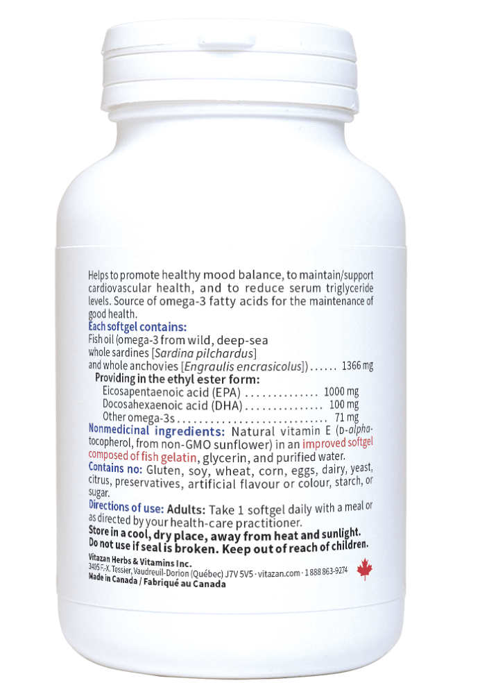 Wild Omega 1000mg EPA from Vitazan helps to promote healthy mood balance, to maintain/support cardiovascular health, and to reduce serum triglyceride levels. Vitazan Wild Omega 1000mg EPA is an excellent source of omega-3 fatty acids for the maintenance of good health.