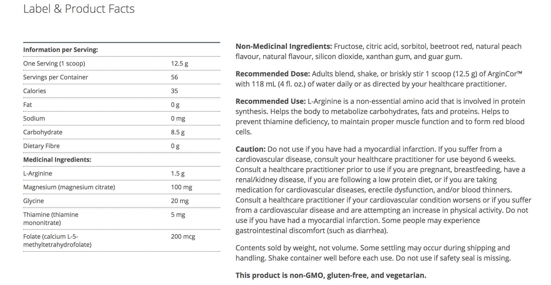 ArginCor from Metagenics is formulated to provide specialized nutritional support. It provides high quality L-arginine, magnesium, folate, and beet powder to increase nitric oxide production to support circulation.