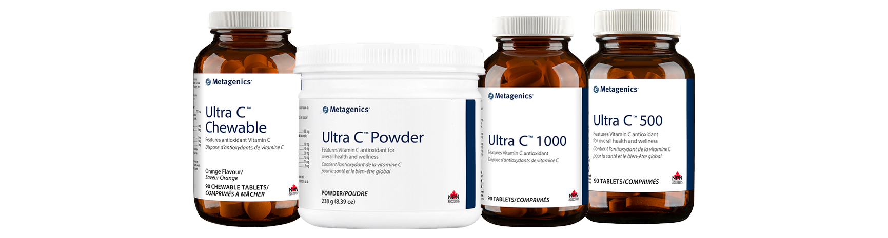 Metagenics Ultra C products offers an exclusive, patented formula designed to enhance the utilization of vitamin C. Preliminary scientific research suggests that vitamin C in the form of Ultra C may result in improved uptake by white blood cells when compared to regular ascorbic acid. Available in Tablet, Powder and Chewable Format.