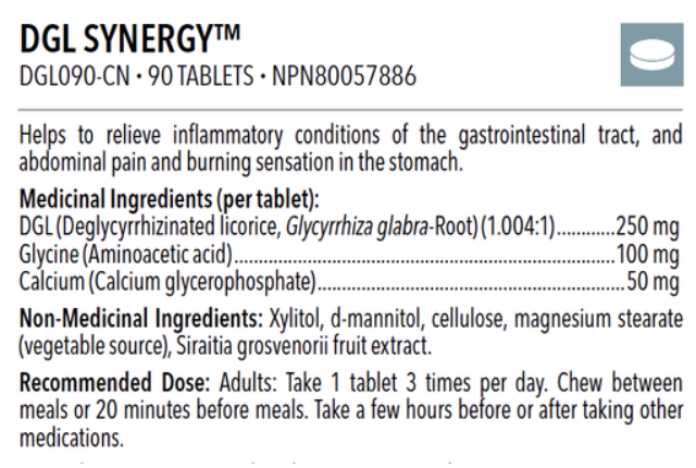 DGL Synergy is a delicious chewable tablet that contains deglycyrrhizinated licorice (DGL), glycine and calcium.  This product acts quickly for heartburn and promotes healing of the gastric lining.