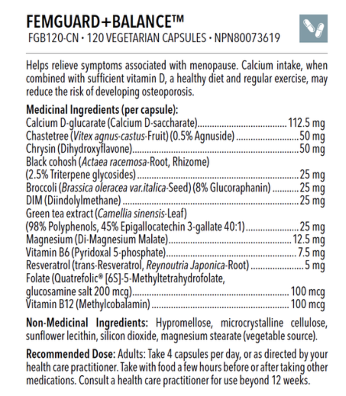 FemGuard+Balance is a supplement that is used during menopause as it contains herbs that help with menopausal symptoms as well as herbs that improve estrogen metabolism and excretion. This formula also contains many antioxidants that helps prevent cell damage.
