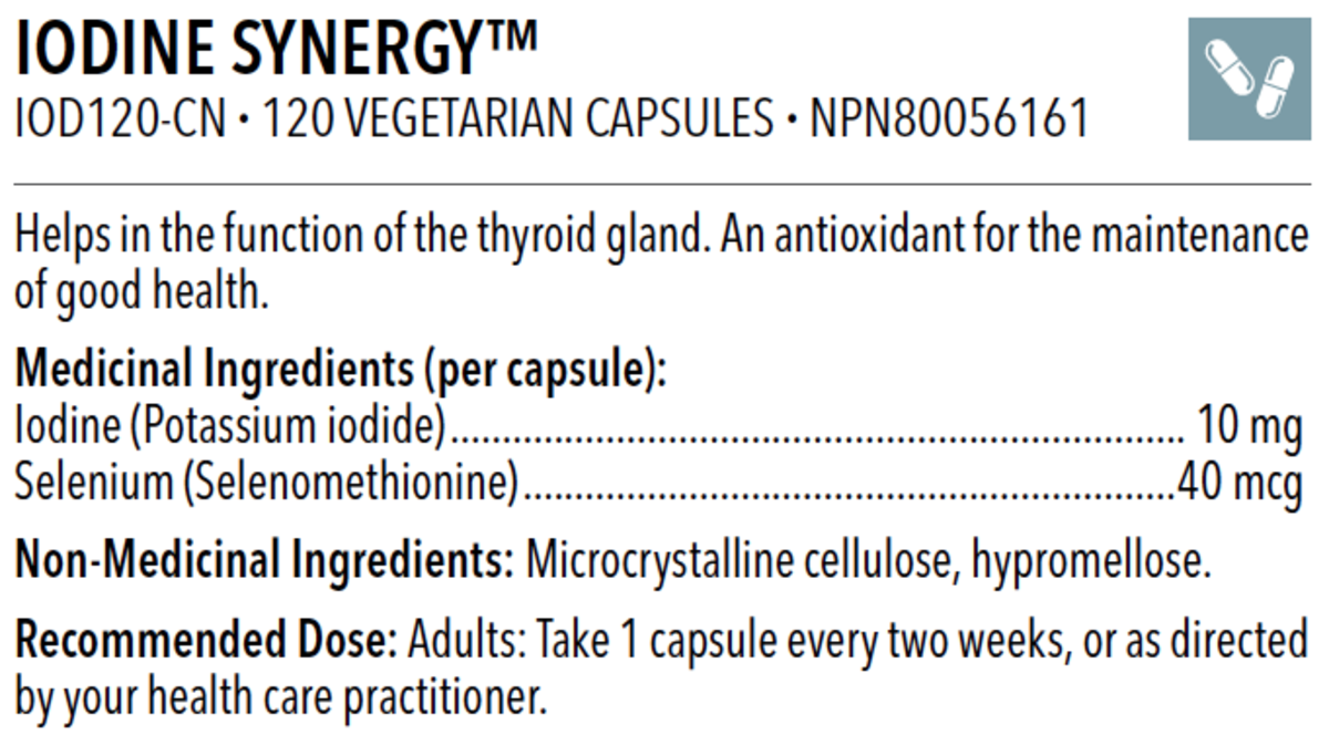 Iodine Synergy contains a high dosage of potassium iodide.  Iodine is crucial for the optimal functioning of the thyroid gland, and the health of breast and prostate tissue. Because this is a high dosage of potassium iodide, it is best that a healthcare practitioner be consulted prior to taking this supplement. While extremely helpful when well-indicated, it may be to too high of a dosage for some people, including those with thyroiditis, who may need to exercise caution with this level of dosage.