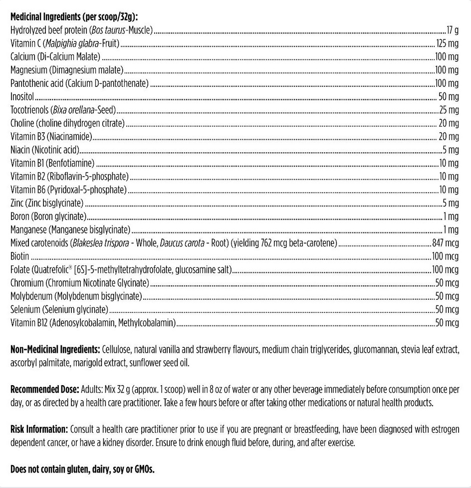 • HydroBEEF™ beef protein – contains a high content of collagen-specific amino acids, proline and glycine, which may be of particular benefit to athletes, aging individuals, and others who experience wear and tear on joints, ligaments, and connective tissue