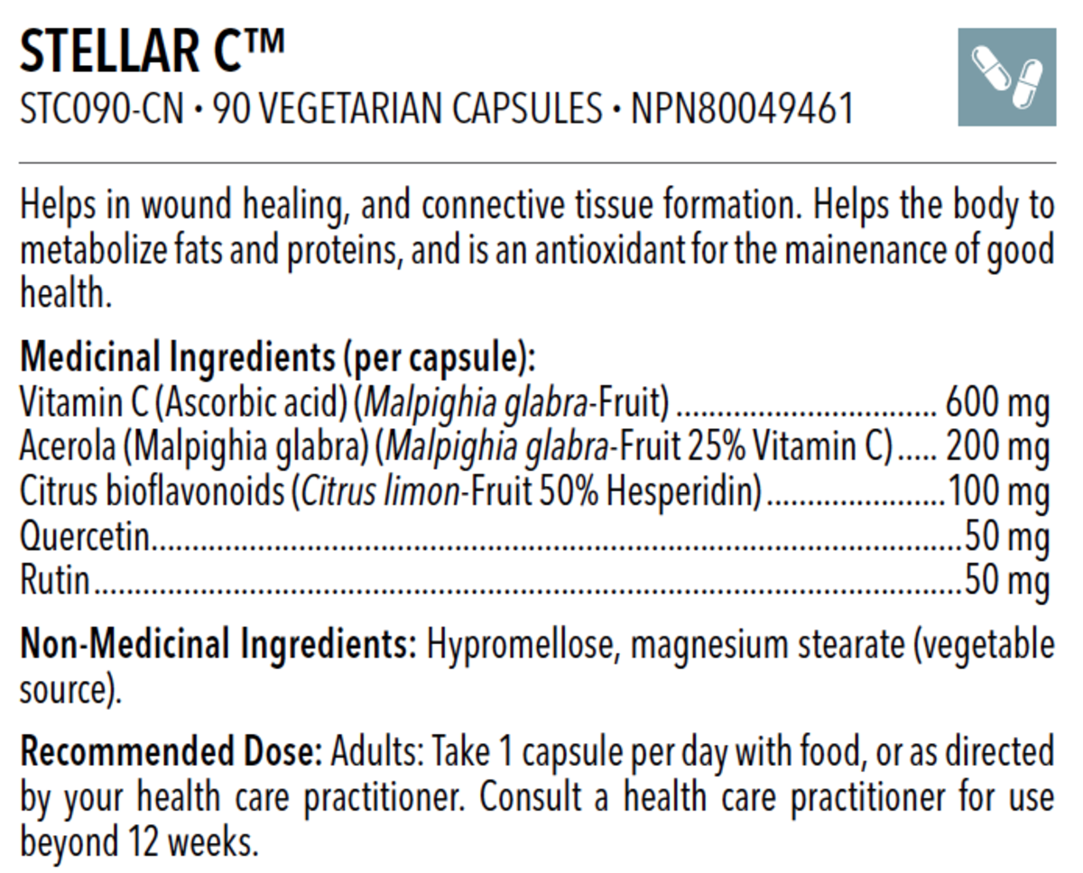 Additional Information/Highlights: Stellar C is rich in vitamin C (from a mixture of ascorbic acid and acerola fruit) and plant bioflavonoids (hesperidin, rutin, quercetin and mixed citrus bioflavonoids), known for their immunoprotective properties. In addition to supporting healthy immune function, these nutrients have been used historically for applications such as maintaining healthly veins, capillaries, skin, hair and nails by supporting normal collagen production and repair.