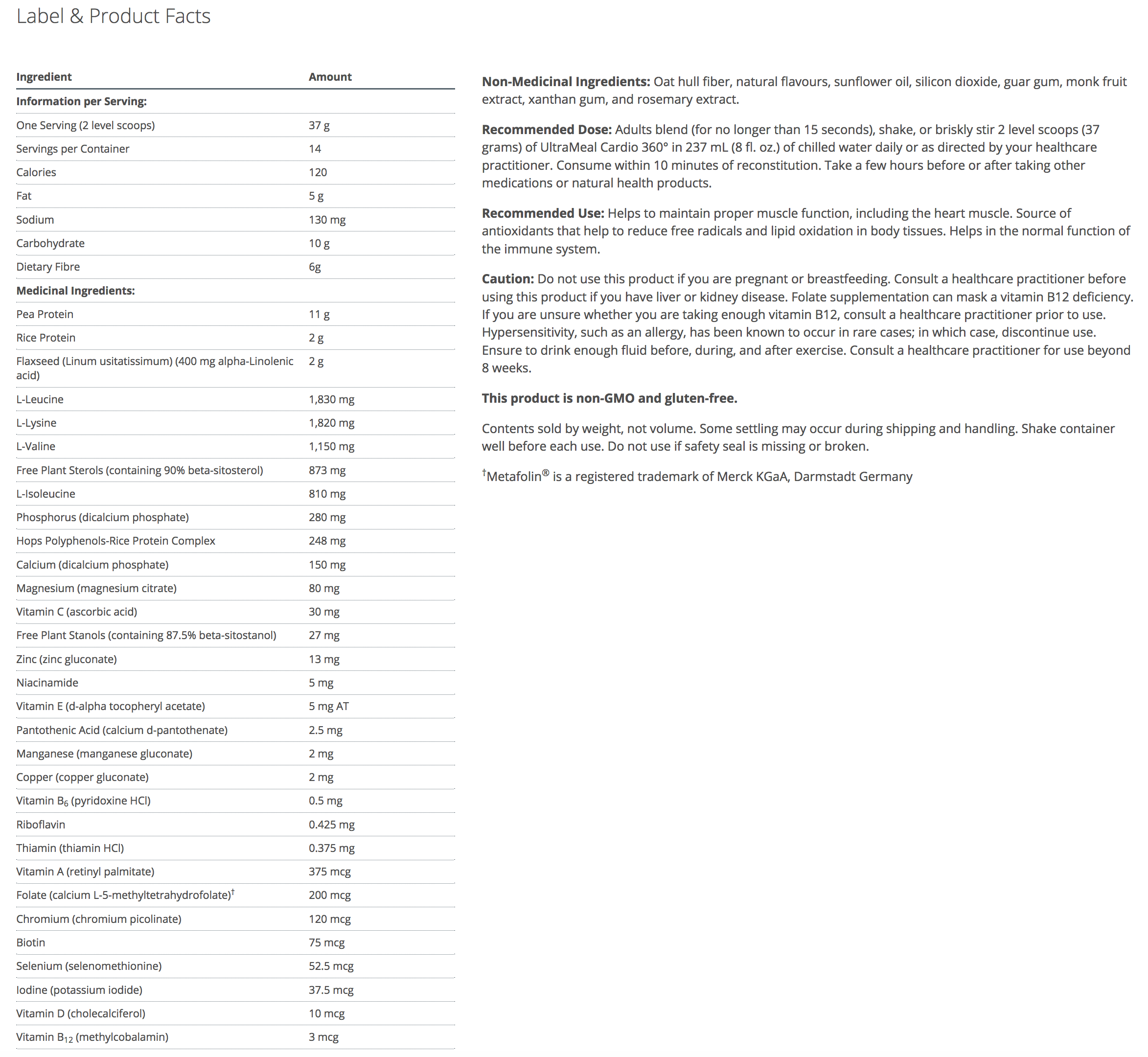 UltraMeal Cardio 360 is a medical food formulated to provide specialized nutritional support within a nutritional management program for dyslipidemia by supplying a combination of phytosterols, bioavailable xanthohumol from hops (XNT ProMatrix®), beneficial macronutrient profile, 5 g of prebiotic isomalto-oligosaccharides, antioxidant nutrients (vitamins C and E), and a proprietary pea/rice protein base with added amino acids. As part of a heart healthy eating plan the addition of 1.8 g/day of plant sterols/stanols has been shown to lead to beneficial changes in LDL cholesterol in individuals with hypercholesterolemia.